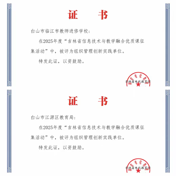 尤为突出的是,白山市教育学院因组织有力、成果显著,被授予 “2025年度吉林省优质数字教育教学资源征集活动突出贡献单位” ,同时有一名负责人荣获 “突出贡献个人” 奖项,这是对白山在教育资源共建共享工作中省级引领作用的充分肯定。